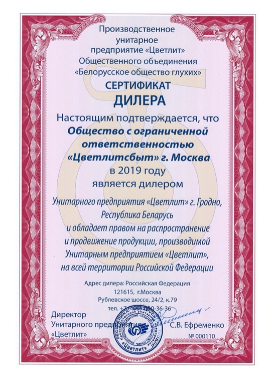 Мы с гордостью представляем продукцию УП «Цветлит» г. Гродно и приглашаем к сотрудничеству всех Покупателей. Для оптовых Покупателей- специальные цены и оперативность поставки, наличие на складе и доставка!
